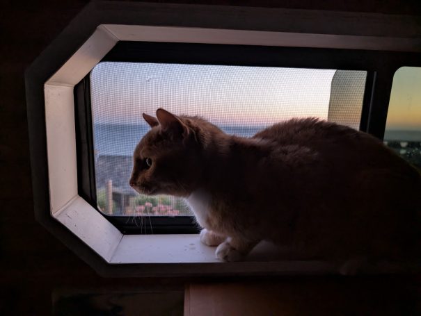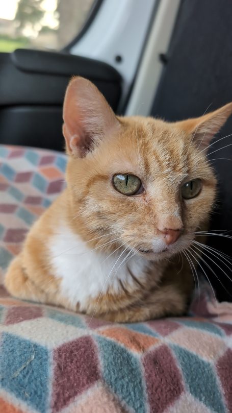 Sleep has been difficult since she left. There’s a weight missing from my bed. The warmth from her laying up next to me and the noise of her purring is dearly missed. She would see other cats in the street near us and whine this obnoxious whine for what felt like forever. I miss that whining. I miss the scratch marks on the back of my right hand from playing with her in the passenger seat while I drive. At the laundromat she would sit on the front dashboard and say hello to everyone who walked by. People noticed her all the time and it was so fun to see people light up when they’d see this cute orange cat in the windshield of a van. She was so sweet that my nephew could play with her and pet her in his typical toddler roughness and she would just lay there and let him. She was the best cat I could have asked for and I miss her dearly so I wanted to share some of the last photos I had taken of her.